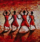 2006Ze lachen, dansen klappend, schuddend, ogen lichten op en tanden eerder op elkaar gebeten, pijn en al het harde donker van de nacht verdwijnt in de muziek, ontstaat de dag. gedicht van LISETTE TOGTEMA